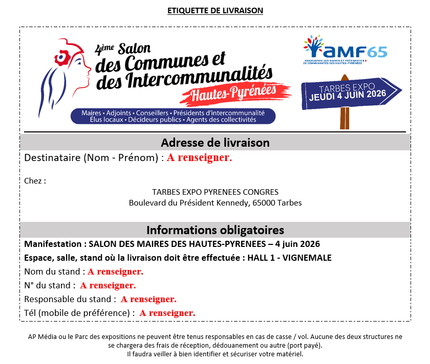 AP Média ou le Parc des expositions ne peuvent être tenus responsables en cas de casse / vol. Aucune des deux structures ne se chargera des frais de réception, dédouanement ou autre (port payé). Il faudra veiller à bien identifier et sécuriser votre matériel.